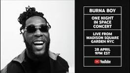 Burna Boy Presents One Night in Space - Live from Madison Square Garden - YouTube Watch Burna Boy live from Madison Square Garden, exclusively globally on YouTube. From 20.45 EST, fans around the world get front row seats to ...